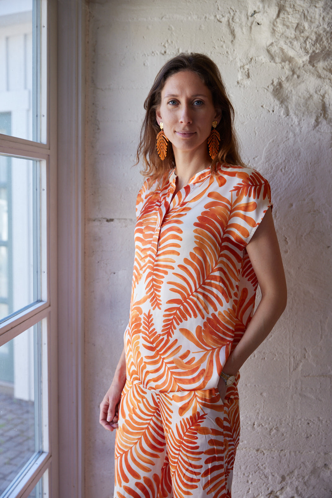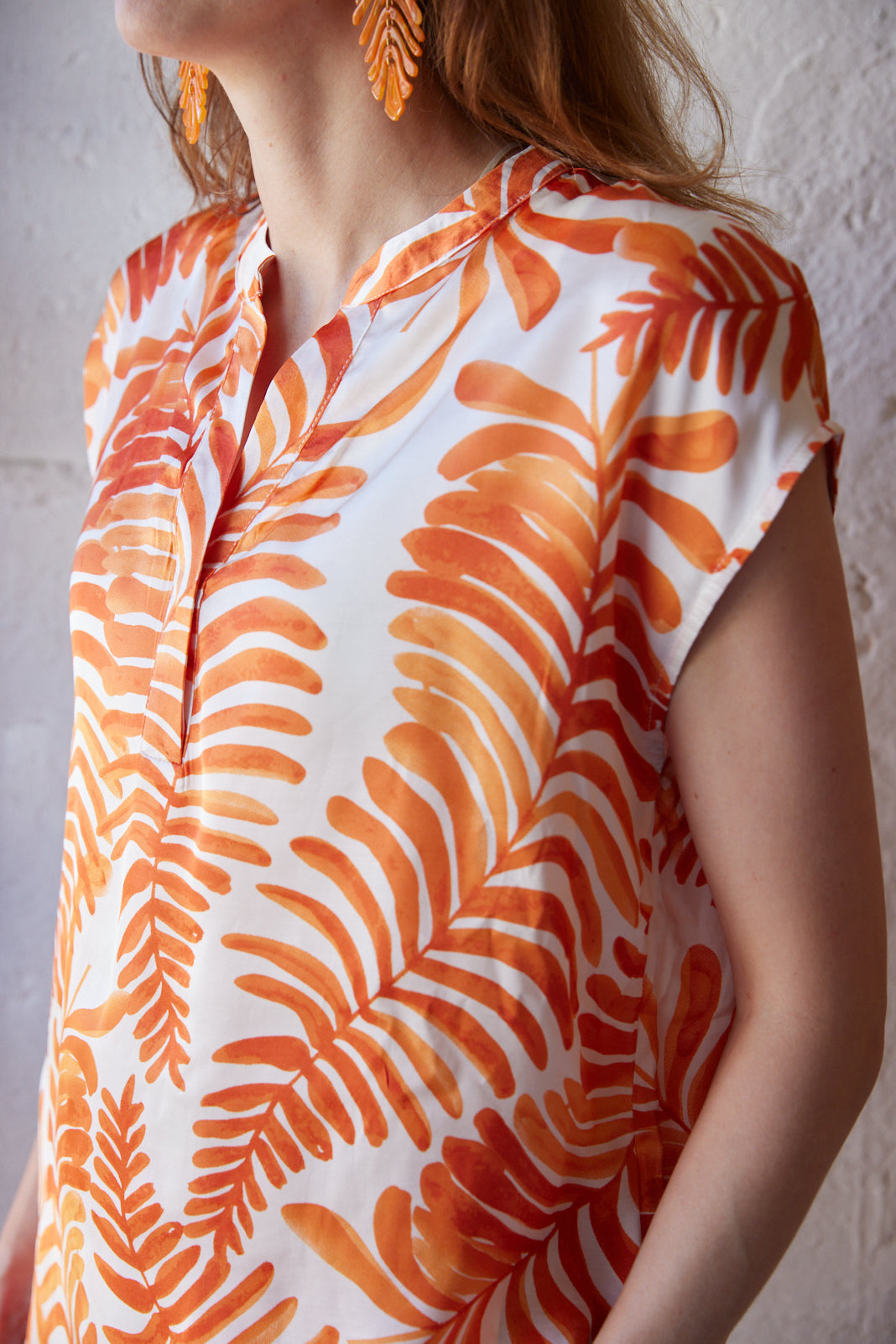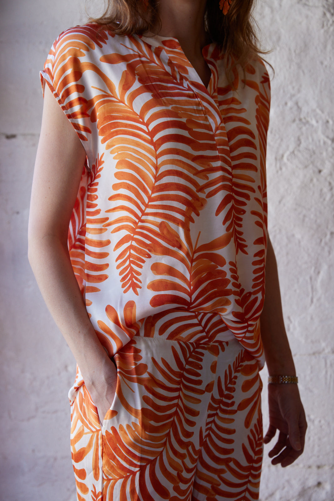 Snygg blus i avslappnad passform med bladinspirerat tryck med en draperad halsringning för en feminin touch.